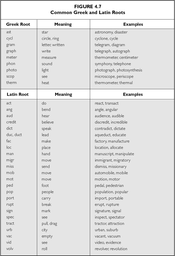 Along with teaching affixes, vocabulary instruction commonly teaches root words. Again, a problem with roots is that they are so numerous that instruction cannot cover all of them. Unfortunately, no usable study has identified the most frequent or the most useful roots. Figure 4.7 identifies some common Greek and Latin roots.