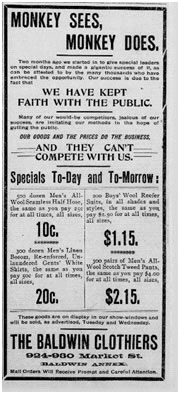 Another example from the Midwest comes a month earlier, in the June 11, 1893 issue of the Milwaukee Sentinel. It's another ad for a shoe sale, which states that the business's competitors