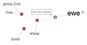 • Display the Visual Thesaurus word map for ewe and click on the pronunciation icon to the right of the word so students can recognize the familiar "ewe/you " sound, and point out that ewe could mean a female sheep.
