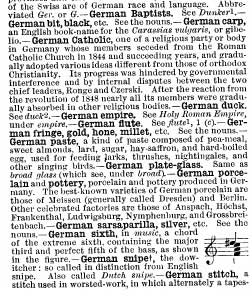 Germany, both today and historically, has prided itself on being an economic powerhouse, but it makes a rather poor showing in English dictionaries and in English generally — at least in so far as the adjective "German" is concerned. Aside from foods (German pancake) and animals (German shepherd), the only salient compounds today are German measles and German silver. It wasn't always so: the Century Dictionary, published in the US in the 1890s, listed several other German compounds (albeit several of them in one of the categories noted above):