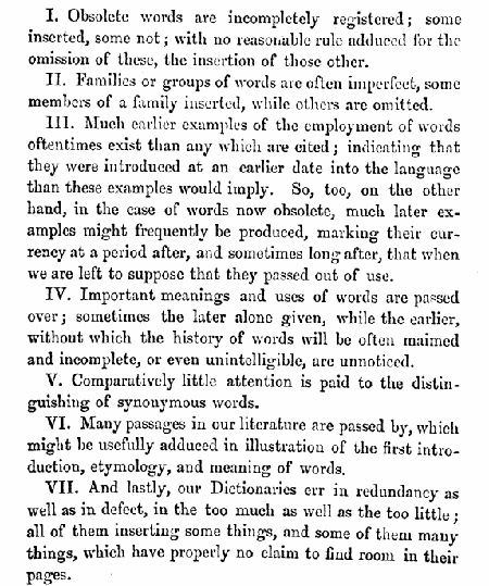 In the mid-19th century, British scholar Richard Chenevix Trench gave two papers that were later published as a booklet with the title "On Some Deficiencies in Our English Dictionaries." His observations were a major impetus for the work that eventually became the Oxford English Dictionary. Trench enumerated seven points that he considered the major failings of the English dictionaries of his day: