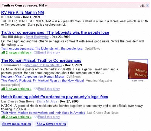 Our personalized Google News page has a section for stories associated with ZIP code 87901: the code for Truth or Consequences, New Mexico. Astonishingly, however, Google News consistently delivers stories to us that are not about this charming desert town at all, but that simply contain the phrase "Truth or Consequences" — a not uncommon journalistic trope. Here, for example, is a recent section from our personalized news page: