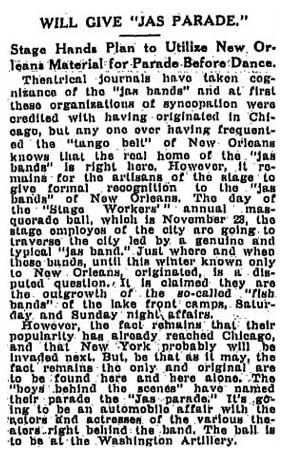 The article explains that the stage hands of New Orleans' theaters were preparing for their annual ball, and that they planned a "jas parade" as part of the festivities. The writer takes the opportunity to give New Orleans the proper credit for the origination of "jas bands": "Any one ever having frequented the 'tango belt' of New Orleans knows that the real home of the 'jas bands' is right here."