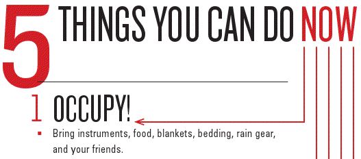 The demonstrators usually call themselves occupiers, though they've also been called occupants or even occupationistas. And with the growth of the movement, the verb occupy no longer requires "Wall Street" or any other object to follow it. About a week after the OWS demonstration began, in late September, people were already talking about "the Occupy protests" and "the Occupy movement." In a newspaper created for OWS, the Occupy Wall Street Journal, a list of "5 Things You Can Do Now" begins with #1: "Occupy! Bring instruments, food, blankets, bedding, rain gear, and your friends." To occupy can now be used as an intransitive verb meaning to take part in the Occupy protests. (Naturally, the hashtag #occupy has taken off on Twitter in recent weeks.)