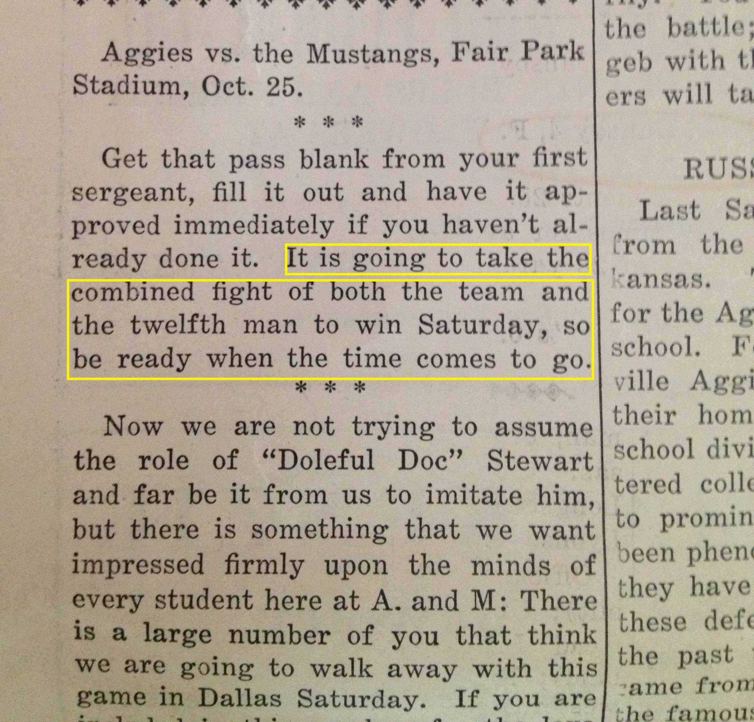 —Dallas Morning News, Oct. 24, 1935The famous twelfth man of the Aggie eleven will be there to give the Farmers all of the moral support they may need.
