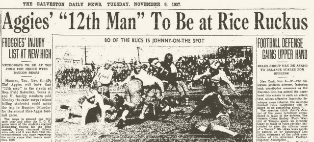 —Dallas Morning News, Nov. 7, 1936Texas Aggies Will Take Famed "Twelfth Man" to Houston for Rice Grid Clash.
