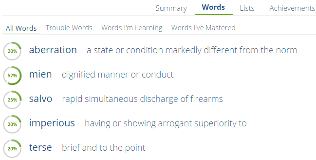 If you want a deeper dive into your word data, just click on the "Words" tab at the top of the page to see complete lists of all the words that you have played on Vocabulary.com, as well as your trouble words, the words you're currently learning, and the words you've already mastered.