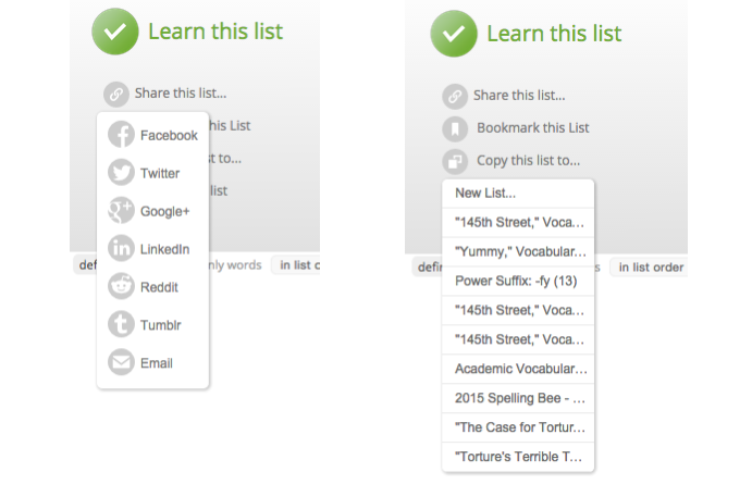 On the right-hand side of any list page, you'll see a menu of options for engaging with the list. The "Share this list..." button allows you to generate a link on social media like Facebook, Twitter, and Instagram. "Copy this list..." allows you to copy any list you encounter into your own account, where you can edit it as a freestanding list of your own, or add the words on it to a list you've already made.