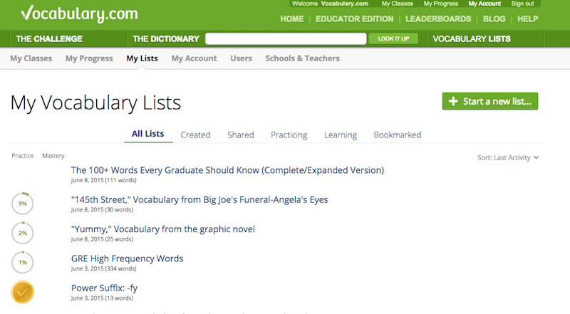 If you click on "View All My Lists," you'll be taken to My Vocabulary Lists. (You can also access this section from your account page.) Here you'll find all the lists you've interacted with in one place. Use the menu at the top of the page to look at lists you've created, lists you're sharing with others, lists you're practing and learning, and lists that you've bookmarked. Within each of these categories, you can fine-tune the display even further, sorting the lists by Last Activity, List Name, Practice Progress, Learning Progress, or Create Date.