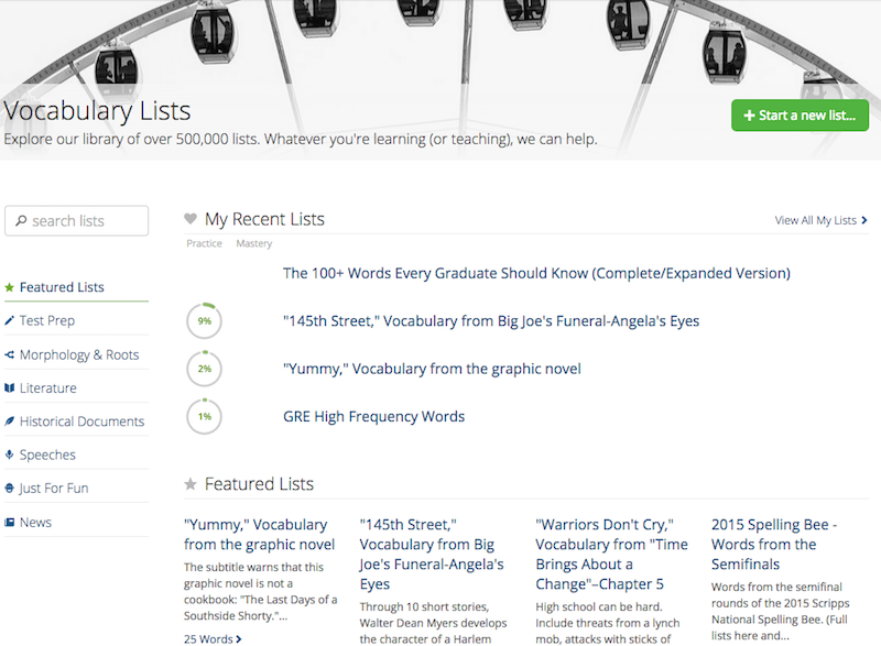 On the Vocabulary Lists homepage, you'll notice a new design that makes list navigation a breeze. At the top you'll see the four most recent lists you've interacted with, and below that you'll find featured lists and the latest offerings in categories like test prep, literature, and news. You can click on any category in the left-hand menu to see a wider selection of the thousands of lists we have available for learning.