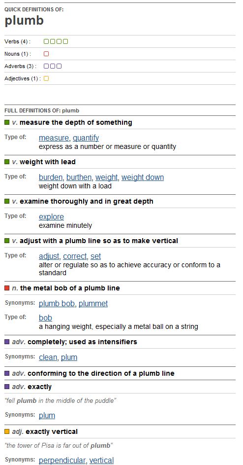 You can see how the definition has been broken out into separate groups, the first of which consists of meanings related to the "exactly vertical" position of a plumb line. Then the second one provides meanings for measuring depth, both literally and figuratively. Finally, the third group encompasses special uses of plumb as an adverb. Vocabulary learners thus get the most useful meanings first but can still appreciate the full range of possible senses extending from significant to peripheral.