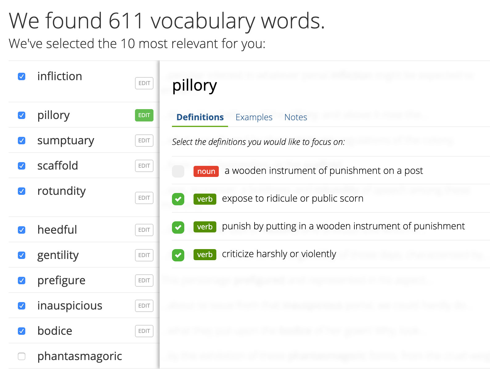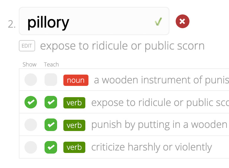 First, when you create a new list, you’ll notice a column of small edit buttons appears for each word you select. Click the edit button, and a new detail panel will slide in for that word. Here you can select (or deselect) the individual meanings you would like us to prioritize when you (or your students) practice this list. Now, when you practice a list, we’ll start by testing just the individual meanings you have selected. However, keep in mind you’ll still need to learn all the meanings of a word in order to master it.