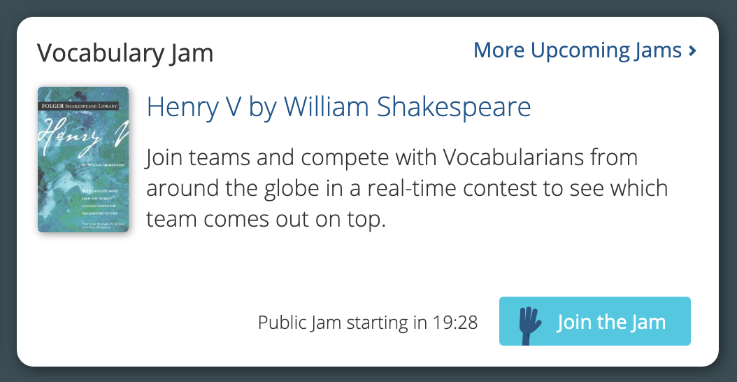 The other place you can see upcoming scheduled Jams is when you finish an activity on Vocabulary.com. We'll show you a "Jam card" that features the next public Jam at the end of every activity.