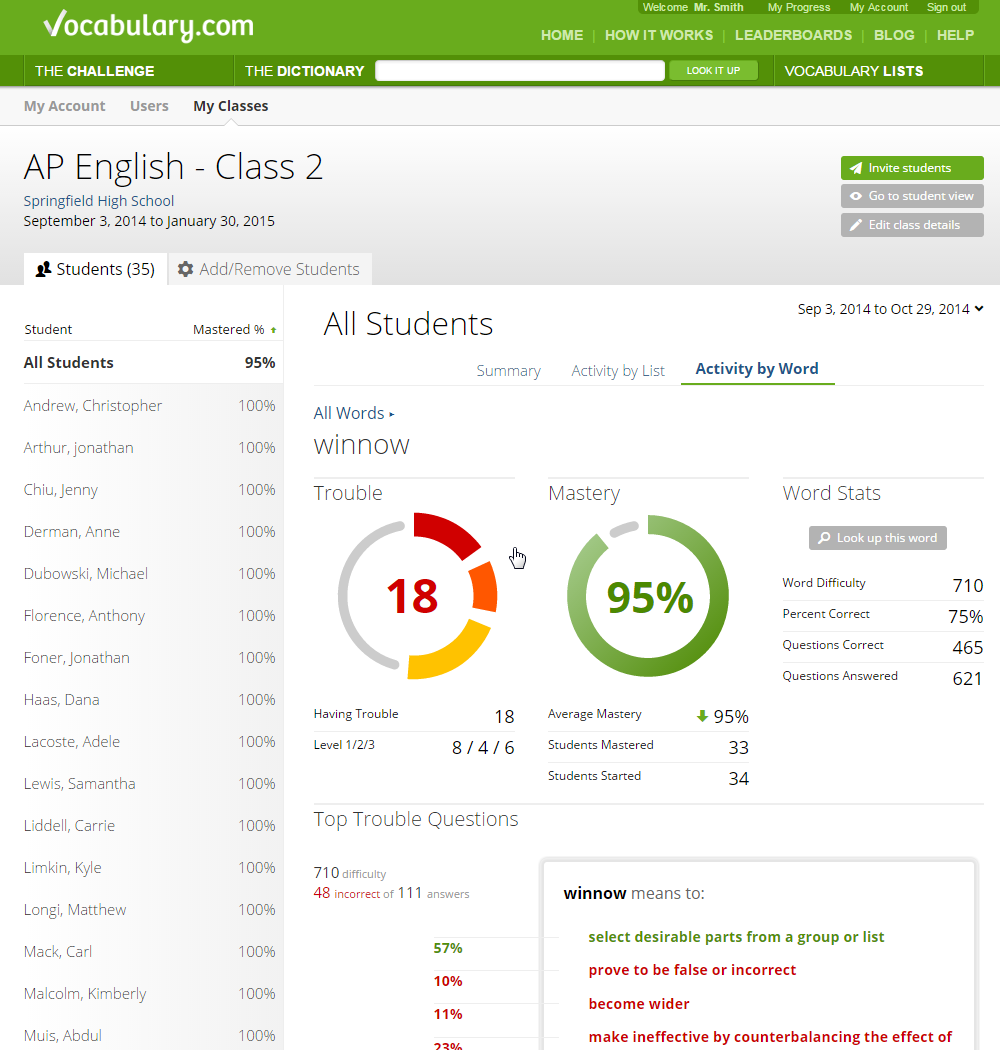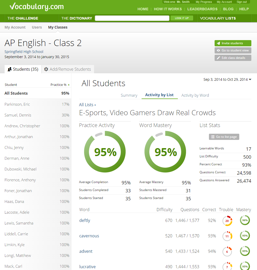 Teachers around the country have been taking advantage of the Vocabulary.com Educator Edition to track student progress in their classes. Now the Educator Edition got even better, with a brand-new Teacher Dashboard that puts the most useful student data at your fingertips with a great new design.