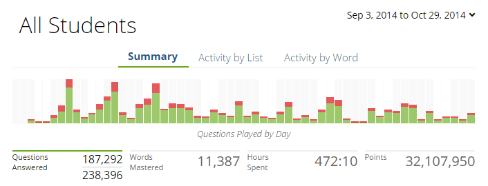 Not only can you drill down on any vocab list or word, but you can also select student names to see an individualized view of how they're progressing. For any student, you can see their activity overall, progress on a particular list, or problems they're having with a troublesome word.