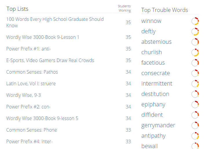 Down below the bar graph is a listing of all the vocabulary lists your class has worked on. And next to that is a handy list of your class's top "trouble" words, with color-coded circles to indicate three levels of trouble the students may be experiencing with those words (based on how often they get questions on those words wrong).
