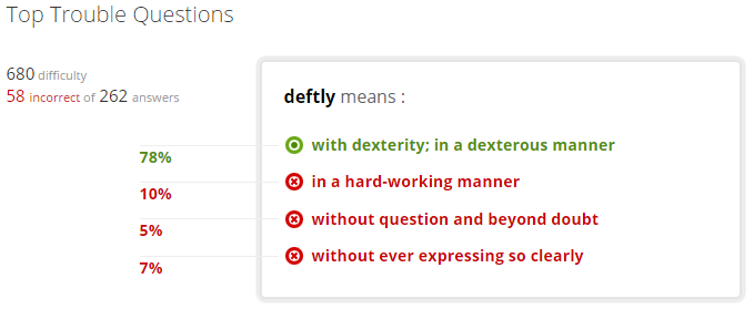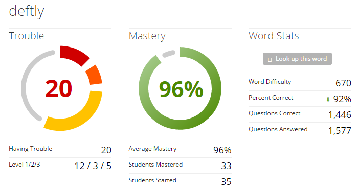 Here, the word deftly tops the trouble list, and we can keep drilling down to see exactly why that word is so vexing. Clicking on deftly pulls up specific stats on how students are handling that word.