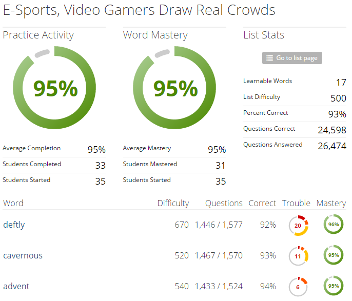 From the summary view of your class, you can drill down to see all the activity on a given vocab list that your class is working on. Here is a list created by a teacher by grabbing the vocabulary from a New York Times article. The Dashboard is full of useful stats, like the percentage of the class that has completed the list as a practice activity, as well as the students' overall progress toward mastering those words on Vocabulary.com. (Here, those numbers both clock in at 95%, but they can be different depending on whether students are going beyond the practice activity to achieve full mastery.)