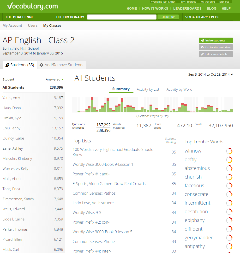Teachers around the country have been taking advantage of the Vocabulary.com Educator Edition to track student progress in their classes. Now the Educator Edition got even better, with a brand-new Teacher Dashboard that puts the most useful student data at your fingertips with a great new design.