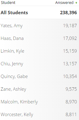 But that's just the beginning. On the left-hand side you'll see a list of the students in the class, which is fully sortable by useful metrics, such as questions answered, words mastered, hours spent, and points earned. Clicking on any of these criteria will also change the view of the bar chart to match what you've selected. Here are the top performers in the class based on questions answered.