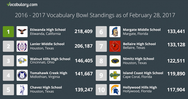 Turning tides. Shifting momentum. Ups and downs. Any of those phrases would work. You get the idea — there was major movement on the leaderboards, which means it's shaping up to be one exciting final stretch for the 2016 - 2017 Vocabulary Bowl season.