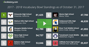 With their 7th monthly Vocabulary Bowl win in October, the Eagles appear to be in it to win it again this season. As defending champions though, Etiwanda has a target on its back, and schools like Walnut Hills, Bellaire High School and Nova High School — all hungry for their first titles — pose a considerable threat. Can the Eagles sustain their perch at number one? Which competitor is ready to surge ahead and knock them off their pedestal? These are the burning questions that keep us glued to the overall words mastered leaderboard!