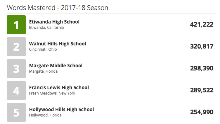 For the first time ever, the number of students playing passed the one million mark. 1,182,635 students from 41,278 schools participated this year. Each and every student who mastered a word played a part in exceeding another monumental goal we set for the '17 - '18 season: surpassing 30 million words-mastered. Together you blew that figure away, mastering a collective total of 32,489,125 words between October 1st and April 30th.