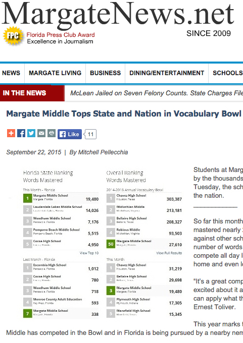 Margate Middle School in Margate, FL, got a short, spirited article published in their local news about their ranking on the state and national leaderboards and their ongoing rivalry with another Broward County school.