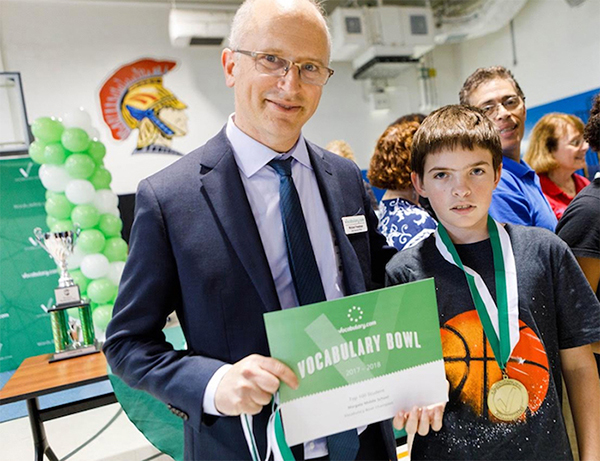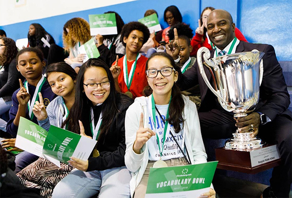 Representatives from Vocabulary.com presented Margate's teachers with the Florida State Champion Banner and the Vocabulary Bowl Middle School Champion banner. CEO Michael Freedman presented Principal Earnest Toliver with the Vocabulary Bowl Champion cup — which Toliver hoisted to thunderous applause.