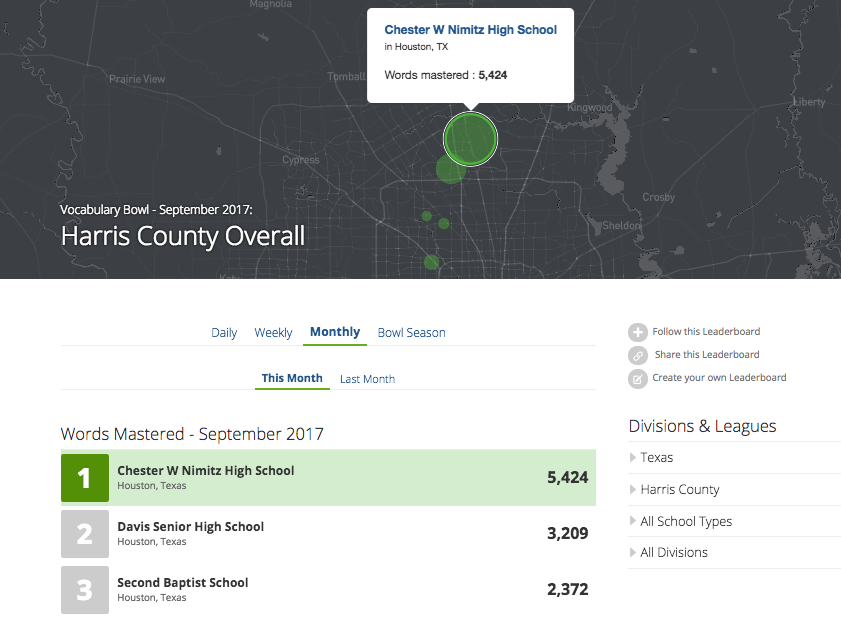 What fuels that competitive Bowl spirit — beyond the thirst for word knowledge and the fact that playing Vocabulary.com is just plain fun? We think it has a lot to do with rivalries, and that's why this year we've brought you a new set of leaderboards — county leaderboards. This new level of competition really brings it home in terms of setting your sites on a school to beat. County-wide rankings will make things very interesting in places like Broward County, Florida, Chesterfield County, Virginia and Prince George's County, Maryland, where many schools have already established themselves as Bowl powerhouses and have been keeping an eye on each other on the state leaderboards.