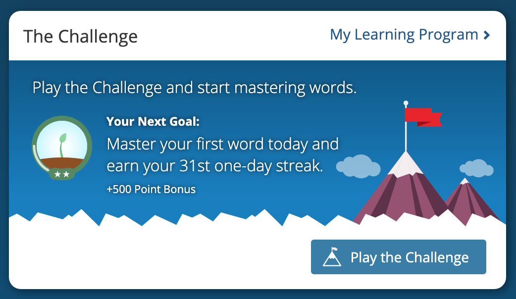 This card invites you to play the Challenge, and will show you your next goal based on what you've been working on and how far you are away from various achievements. The Challenge is where you work on all the words in your learning program, with the goal of mastering new words and brushing up on all your current trouble words.