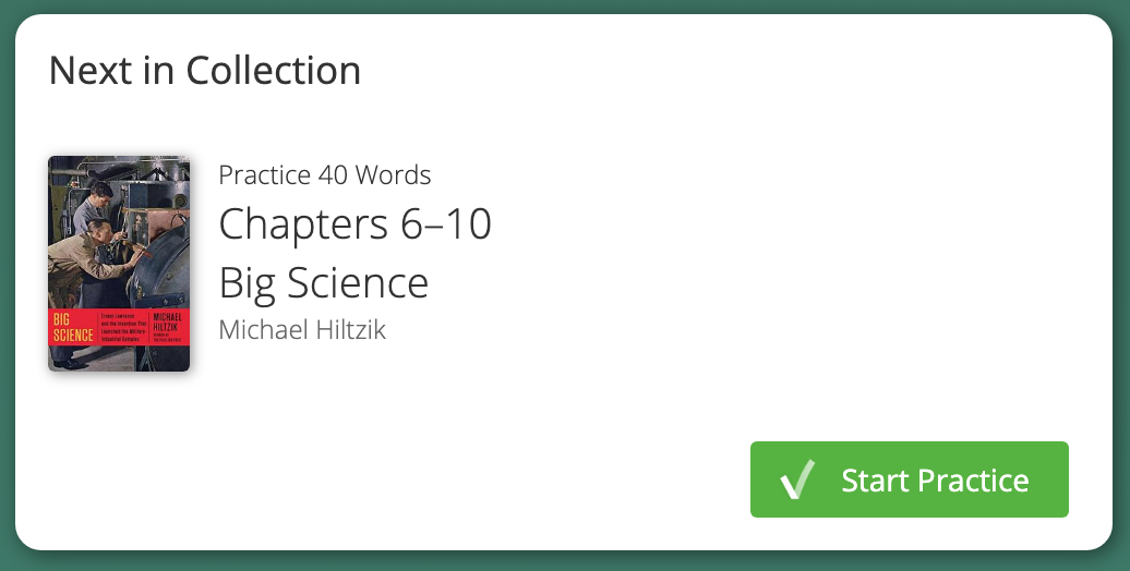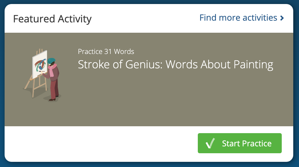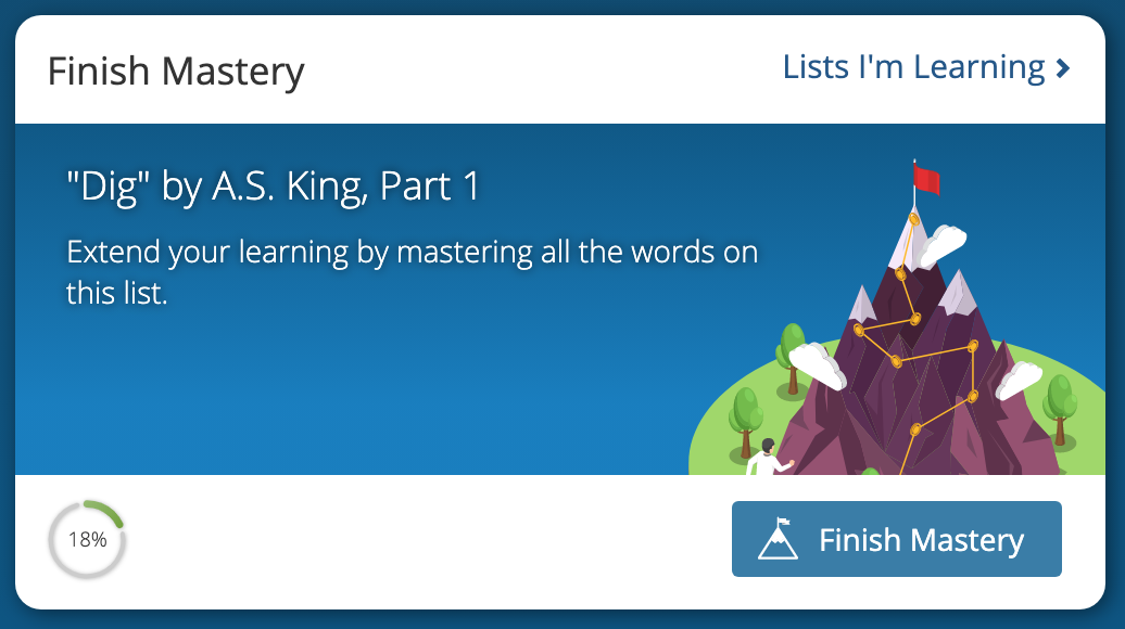 If you've practiced a list, and elected to continue to master all the words in the list, you'll see this card. Click the "Finish Mastery" button to play a version of the Challenge where you focus primarily on the words in a list until you master all of them. It's a great way to extend your learning on a list you've been practicing.
