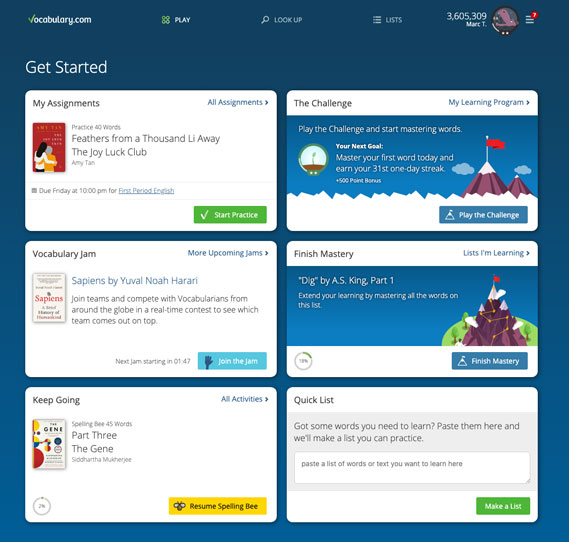When you first log into Vocabulary.com as a student or if you click "Play" in the main navigation, you'll see the new cards. Depending on what you've been doing on Vocabulary.com, you'll see a different set of cards chosen just for you, giving you several options for what you can learn next. Our goal is to make it easier for you to navigate between all the different activities available to you, and to make using Vocabulary.com easier and more fun.