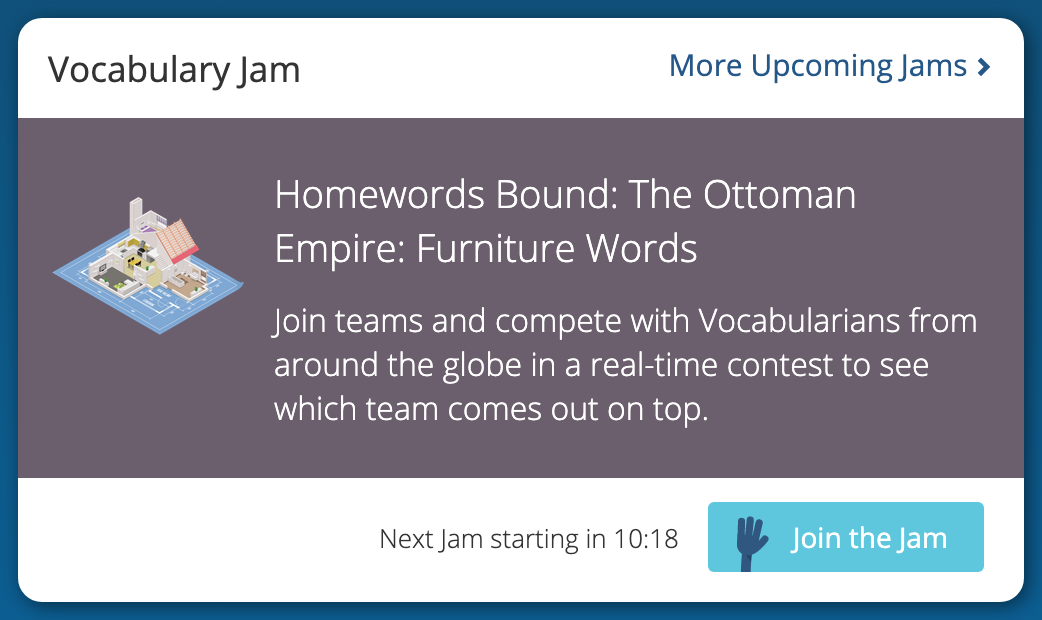 This card shows you the next upcoming scheduled Vocabulary Jam you can join. Play in a public, scheduled jam against other members of the Vocabulary.com community and help your team win this real-time, head-to-head competition. See our post about the new scheduled Vocabulary Jams for more information.