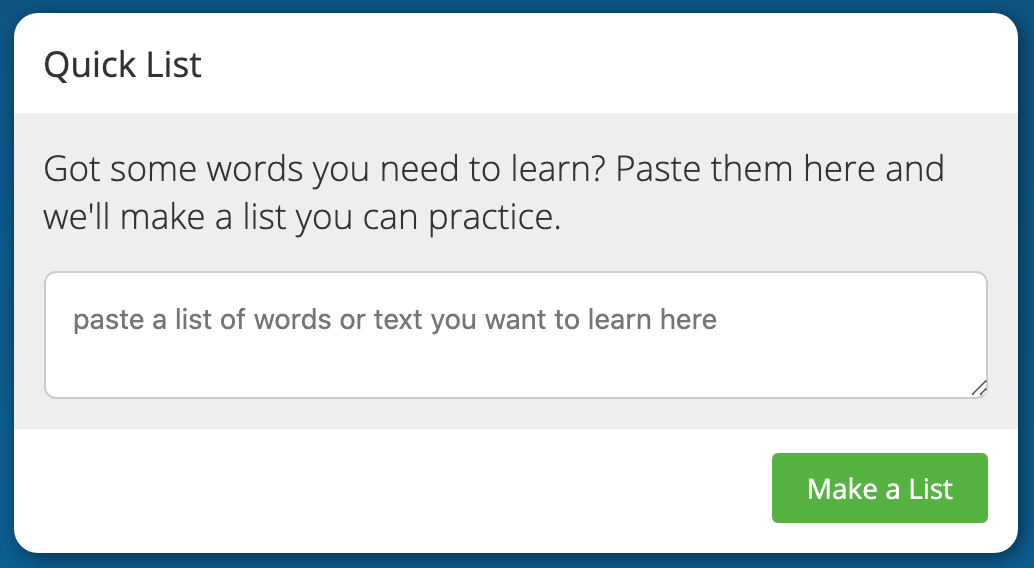 Paste a list of words you'd like to learn and we'll create a list that you can Practice, play a Spelling Bee, or create a Vocabulary Jam from. It's the fastest way to start mastering a list of words you want to learn.