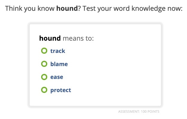 When you click the green button, you'll jump right to a question that teaches you the word:
