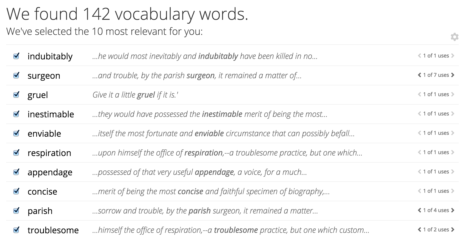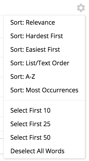 Selecting which words to focus on is customizable too. If you'd like to go beyond the ten most relevant words in the text, click on the gear icon in the top right corner after we've grabbed the vocab. There you'll see a range of options for sorting and selecting words from your text. You can also manually check or uncheck the box next to each word, depending on which words you'd like to choose.
