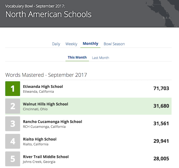 The 2017-2018 Vocabulary Bowl season starts on October 1st. Over one million students from thousands of schools across North America will play, compete and learn. Are you ready to put your school on the map?