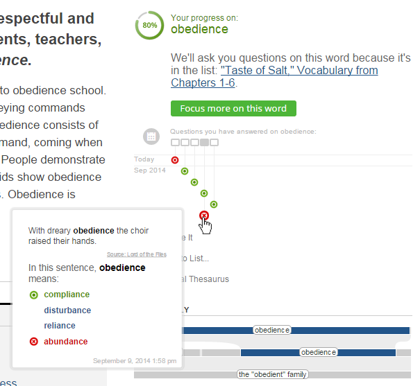 Hover over the green and red dots in the progress display and you can see all the past questions you've taken on the word, including the answers you picked. Questions are sorted by date, and you can click the calendar icon on the left to see the questions expand into a nifty timeline view.
