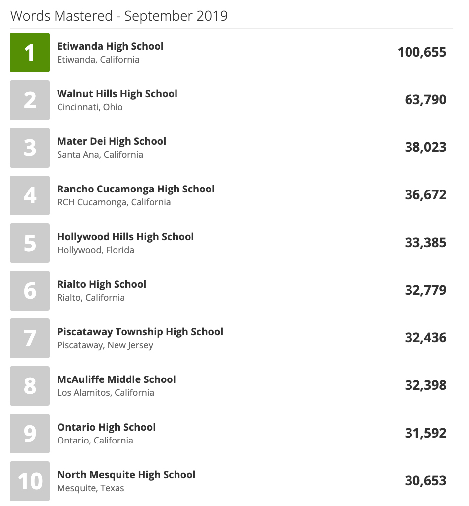 September is always an exciting month for Bowl fans as schools everywhere amp up the word-learning in anticipation of the Vocabulary Bowl season, which just kicked off on October 1. Lots of familiar names from last year's competition top the leaderboards, like Etiwanda, 2018-2019 High School Runner-Up Walnut Hills, and Middle School Runner-Up McAuliffe. But what really gets everyone's attention is seeing the rookie schools rising in the ranks — the names that have never been on our radar before and appear to be ready to make their move in the upcoming season. Two schools that we haven't seen playing at this level before are Mater Dei High School and Ontario High School, both hailing from California.
