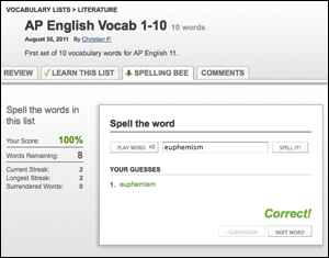 We’re excited to announce that as of today, any Vocabulary List on Vocabulary.com can be played as a spelling bee. Now, you can use Vocabulary.com to practice your spelling as well build your vocabulary.