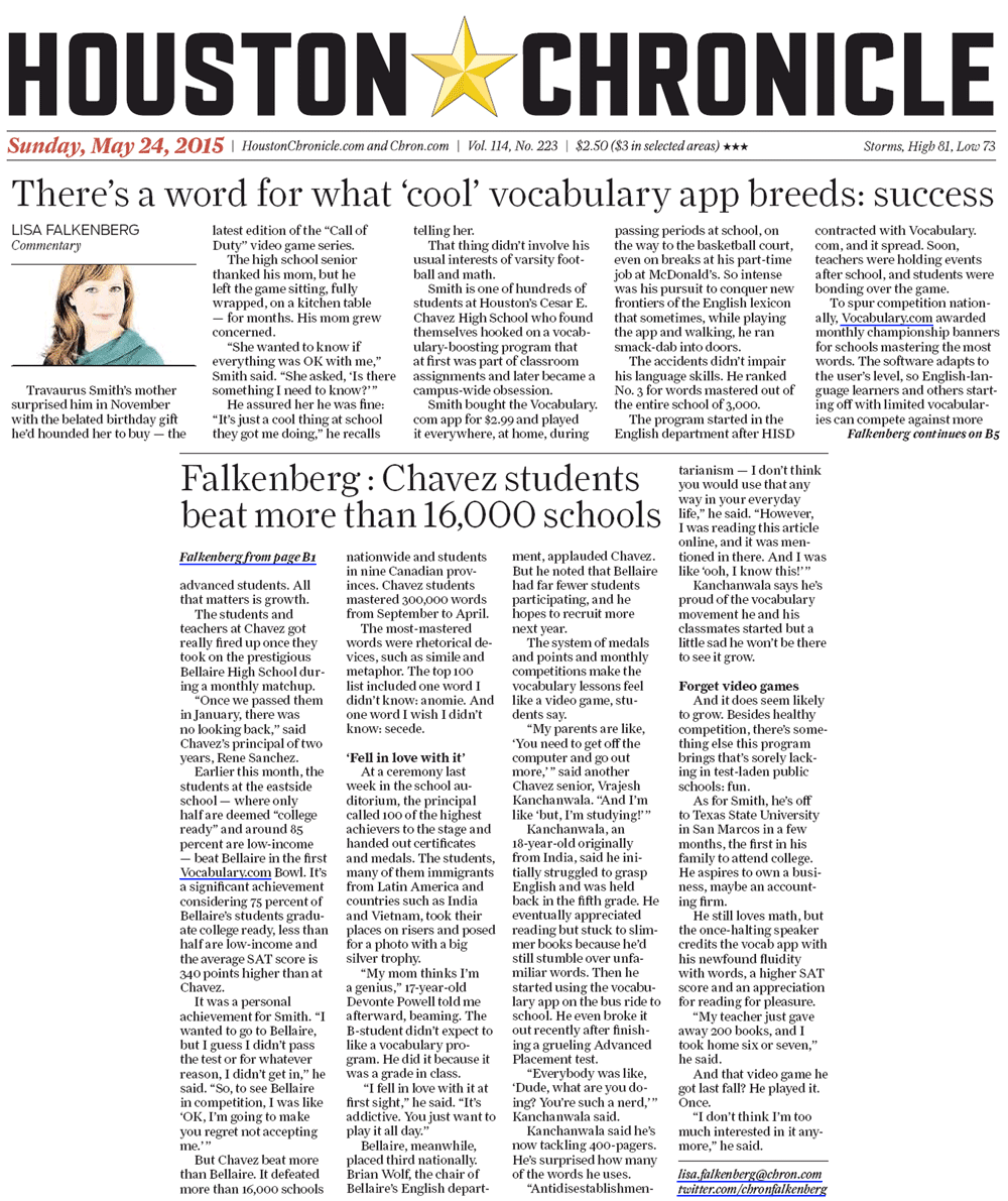 Writing in Sunday's Houston Chronicle, Pulitzer Prize-winning columnist Lisa Falkenberg shone a spotlight on the hundreds of Houston students who got hooked on Vocabulary.com, as one "campus-wide obsession" turned into a recipe for district-wide academic success.