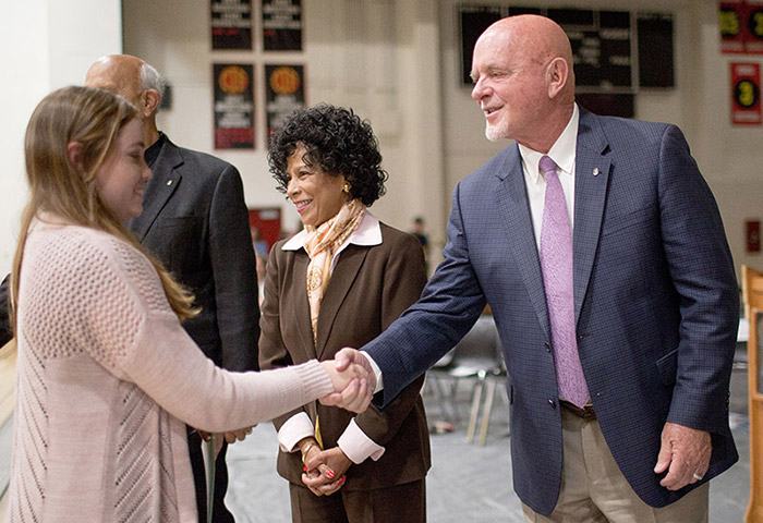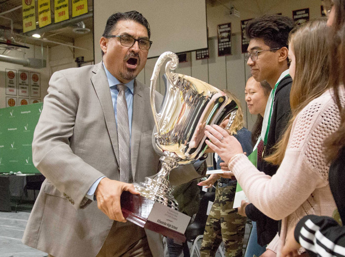 Rancho Cucamonga city officials came to show their enthusiasm and support for the Etiwanda Eagles. Shaking students' hands in a receiving line were Mayor Dennis Michael, Mayor Pro Tem Lynne Kennedy, and City Council Member Sam Spagnolo. Mayor Michael presented Principal Jaramillo with an official commendation plaque from the city, which will be proudly displayed alongside the trophy. Chaffey Joint Union High School District Assistant Superintendent of Instruction Jim Cronin and Director of Technology Mike Bement also participated, giving out medals and certificates.