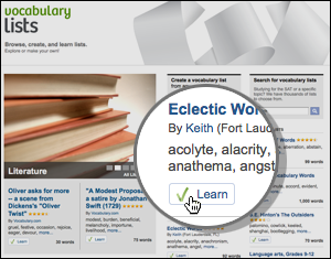 You can learn a list that you make yourself (click here to start a new one), or peruse the 10,000+ lists that already live on Vocabulary.com. We’ve added a “Learn” button to show you which lists are ready to go. Clicking on the button will take you immediately to a Challenge that's tailored to the words you're interested in — anything from literary terms to words in the news.