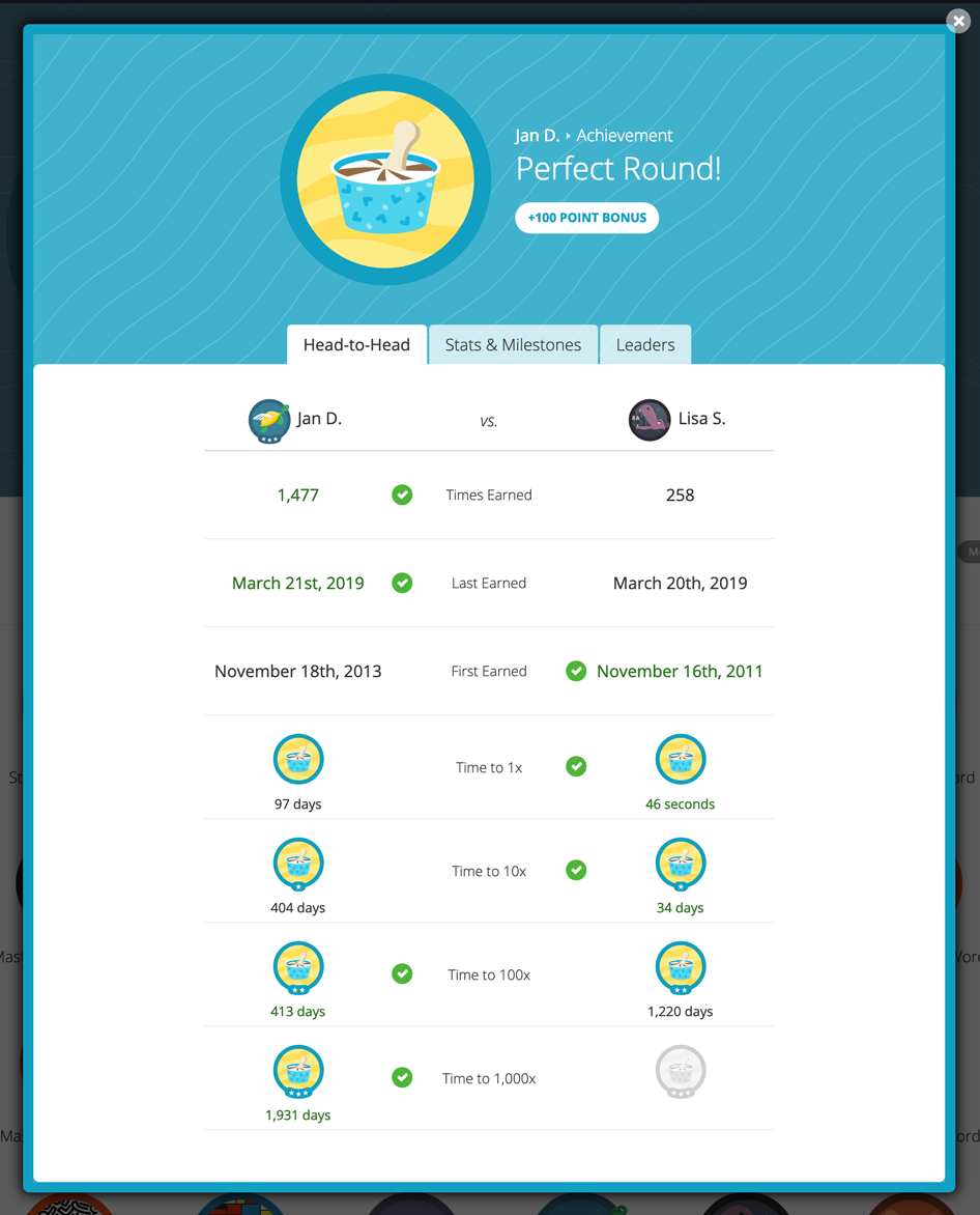 Sure — it's great to earn achievements — but it's also fun to see how you stack up against other players in the Vocabulary.com community. Now, when you click on someone else's profile (say in a leaderboard), you can explore all the achievements they've earned. And, if you click their achievements, you can see how you two compare. Who earned it first? Who was the fastest to reach the 3rd milestone? Who earned it most recently? We make it easy to geek out on all the stats, and truly know who's dominating the achievement showdown.