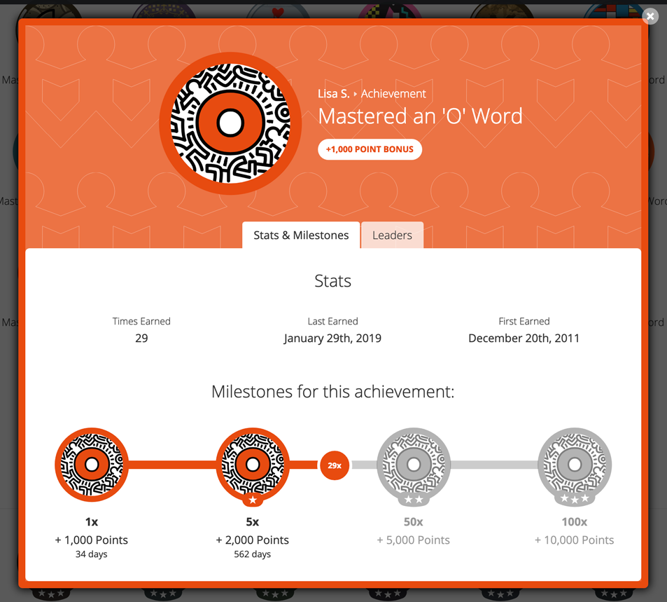 We've added a new feature to achievements called milestones which reward you for earning an achievement multiple times. For example, let's say you master an "A" word for the first time — that'll earn you a 1,000-point bonus (same as always). But now, when you master your 5th "A" word, you'll earn your first milestone and get your first star on the Mastered an "A" Word achievement. Along with that star, you'll also get a milestone bonus of 2,000 points — not bad!