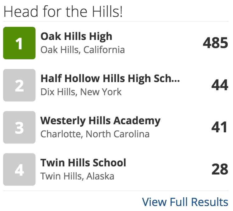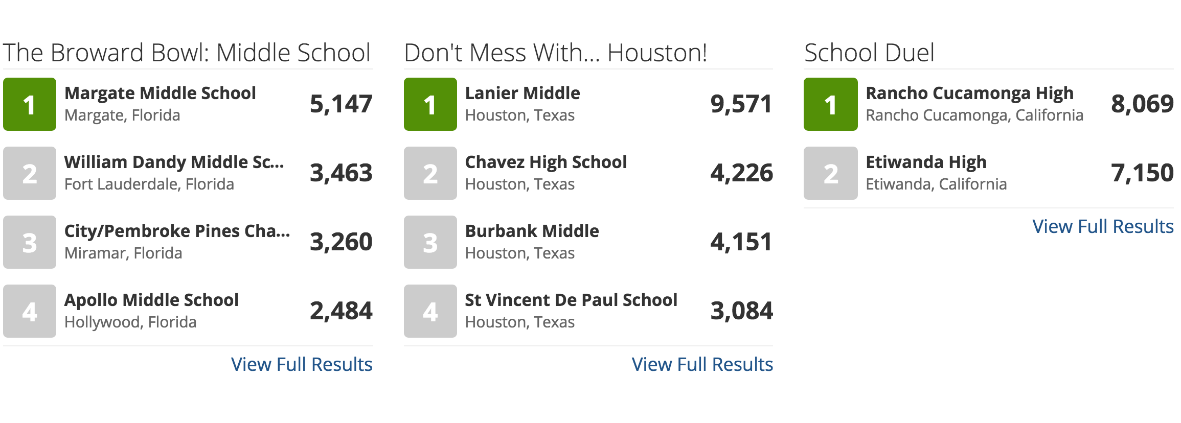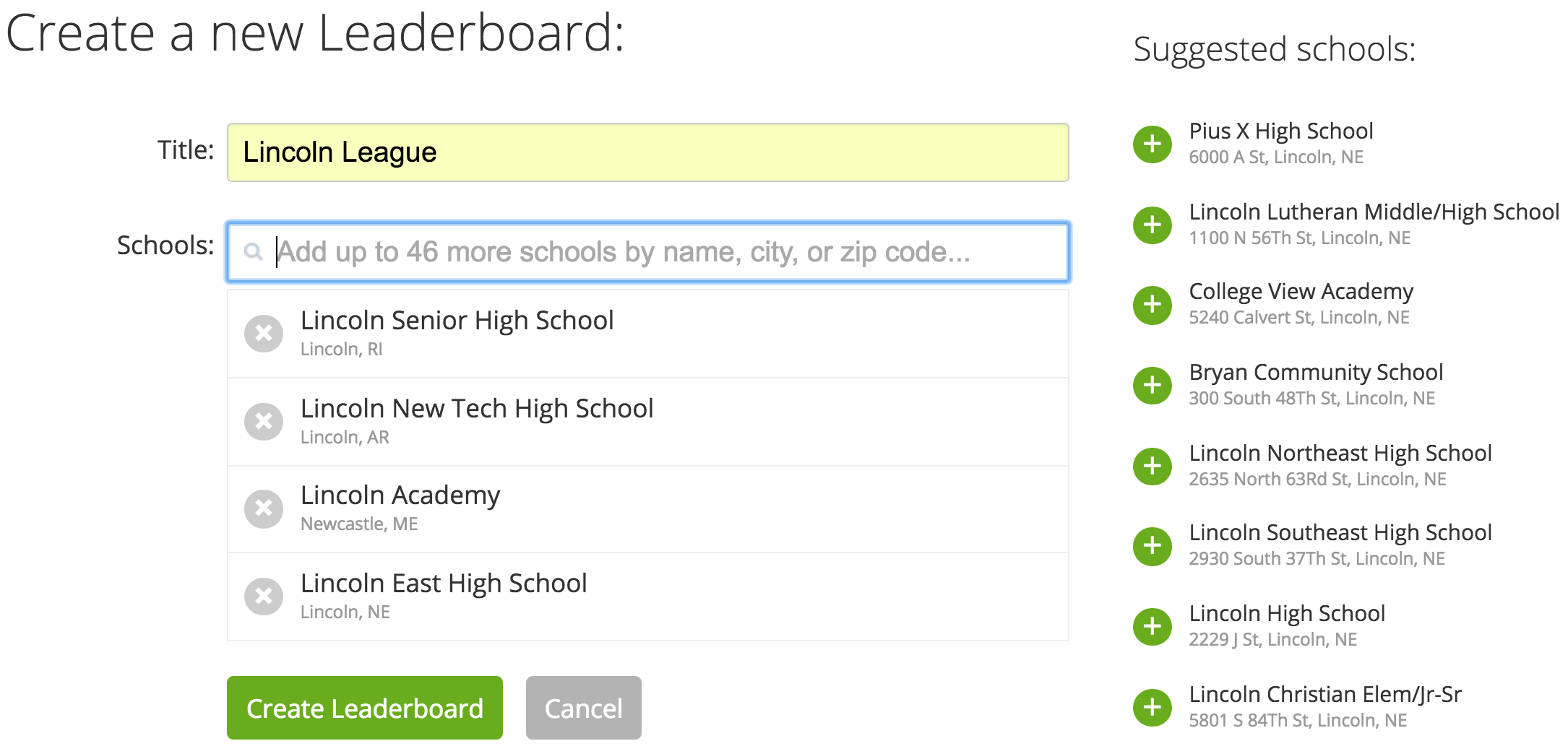 Now that you've come up with a snazzy name, it's time to share your leaderboard with your friends and colleagues. When you create a leaderboard or follow one that was shared with you, it will appear on your leaderboards homepage. Leaderboards that include schools you're playing for will also appear on your round summary page. Now, when you finish every round, you can see how your effort is propelling your school to victory.