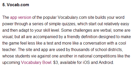 In a roundup of "8 Great Games That Will Make Your Kids Smarter," Yahoo Tech included Vocabulary.com as a title with "a lock for the honor roll."