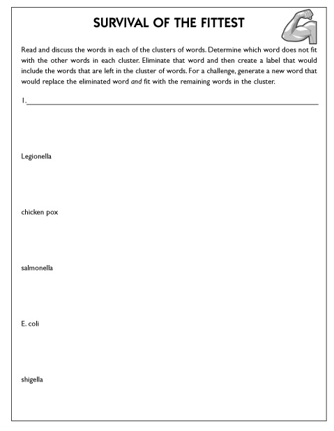 Survival of the Fittest works with predetermined groups of words related to the topic or unit of study. Students are given clusters of four or five words and asked to determine which word would not survive or doesn't fit with the others. Students eliminate that word and create a label that would be appropriate for the remaining words. The label should describe what makes the remaining words fits together. An additional task could include asking students to generate a new word that would take the place of the eliminated word so that it would fit with the remaining words.