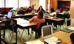 When networked computers first came to schools, most were desktop machines that did not move easily. The flexible approach to classroom landscape outlined above was very difficult with such equipment and many schools built computer labs will most of the equipment bolted to the floor. Many of those labs had computers lined up in rows facing the front of the room. Teachers in such classrooms had little choice but to adjust to a single reality, except that they could change the front of the room to the back by stepping behind the students where they would be able to see their screens.